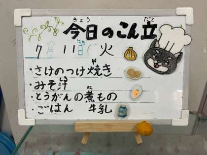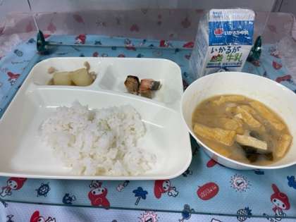 今日の給食は、さけのつけ焼き、みそ汁、とうがんの煮物、ごはん、牛乳です。