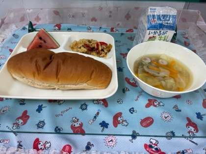 ?今日の給食は、パエリア、ウィンナーとキャベツのスープ、すいか、こくとうパン、牛乳です。