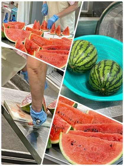 今日は、給食で年間で1回、7月にだけ登場する「すいか」が出ました。すいかは、切った時に上の部分ほど甘みがあります。今日は、みんなに甘い部分が行き渡るように、1玉から64切れとることができるように給食調理員さんが均等に切ってくださいました。