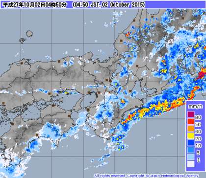 台風21号の雨雲から発達した低気圧。夜半に寒冷前線を伴い大阪市内を通過し、明け方には三重県沖の太平洋へ過ぎ去っていきました。(画像は、大阪市通過後の寒冷前線「気象庁・レーダー・ナウキャスト」より)