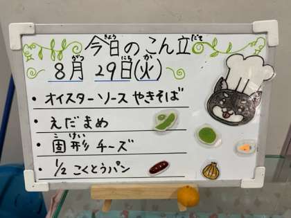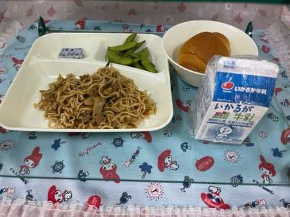 今日の給食は、オイスターソース焼きそば、枝豆、固形チーズ、1/2こくとうパンです。