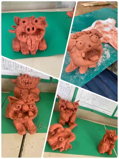 社会科で沖縄についての学習をしたので、粘土でシーサーを作りました。シーサーは沖縄県などでみられる魔除けの獣像だそうです。それぞれ個性的なシーサーが出来上がりました。