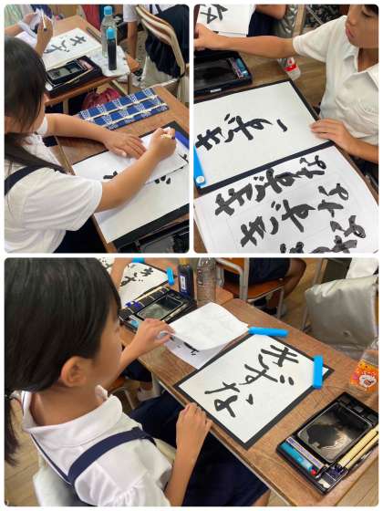 2学期初めての習字は「きずな」と書きました。ひらがな3文字を整えて書く練習をしました。はじめは、最後の「な」が入らずに苦戦しましたが、最後にはなんとかバランスよく書きました。