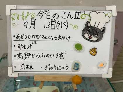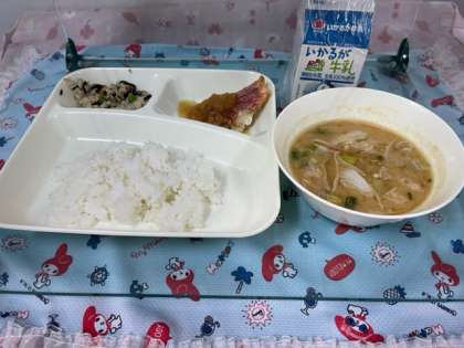 今日の給食は、あかうおのおろしじょうゆかけ、みそ汁、高野どうふのいり煮、ごはん、牛乳です。