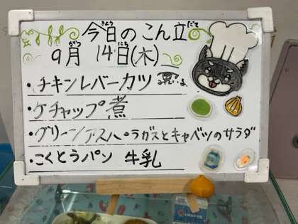?今日の給食は、チキンレバーカツ、ケチャップ煮、グリーンアスパラガスとキャベツのサラダ、こくとうパン、牛乳です。