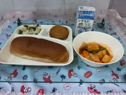 今日は子ども達に人気の「ケチャップ煮」でした。ケチャップ味の洋風の煮物です。缶詰のトマトも入り色鮮やかな赤色に仕上がりました。