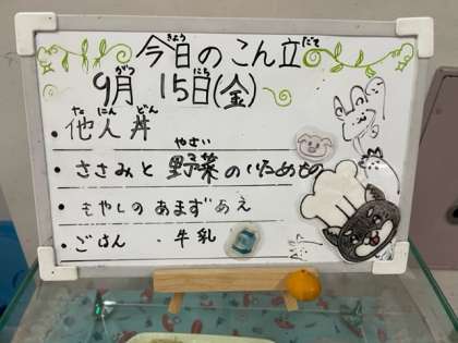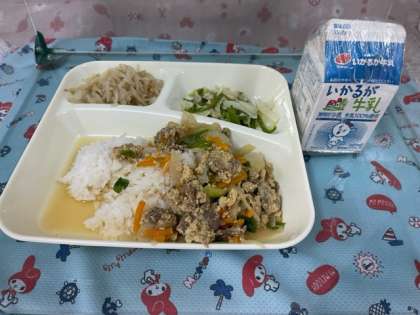 ?今日の給食は、他人丼、ささみと野菜のいためもの、もやしの甘酢あえ、牛乳です。
