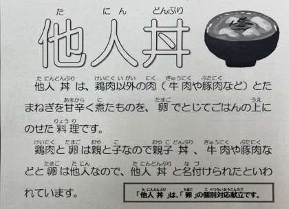 他人丼は、東日本では「豚肉」を、西日本では「牛肉」を使うことが多いです。甘辛く味付けされて卵でとじられた他人丼は、子ども達に大好評な献立です。