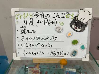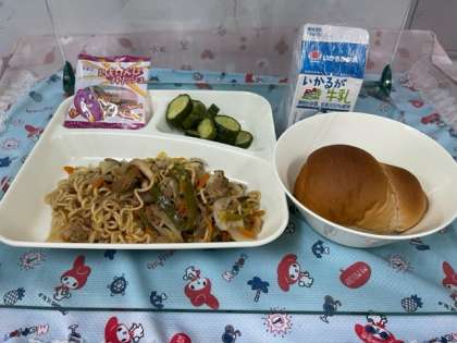 ?今日の給食は、焼きそば、きゅうりのしょうがづけ、いもけんぴフィッシュ、1/2パン、牛乳です。