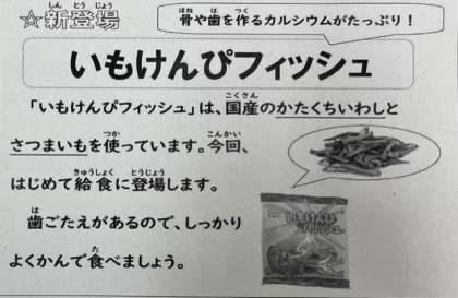 本日の「芋けんぴフィッシュ」は給食に初登場でした。国産のかたくちいわしとさつまいもが使われています。