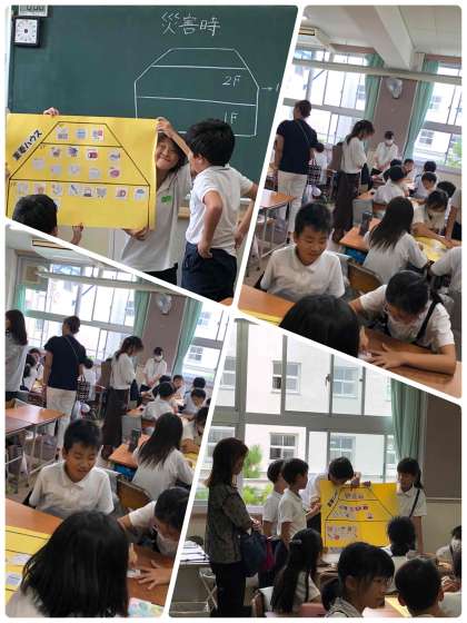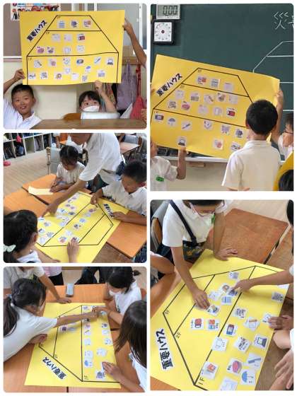 1つは、防災ハウスとして、非常時に必要な物は何かを考える学習。重要ハウスの1〜3階にはどんなものが入るか。3階には最も重要な物を3つ班で選び、その理由を発表しました。