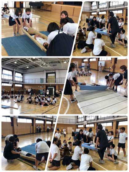 もう一つは、2本の棒とマット1枚で、簡易担架を作りました。声を掛け合いながら、4人で力を合わせて、運びました。