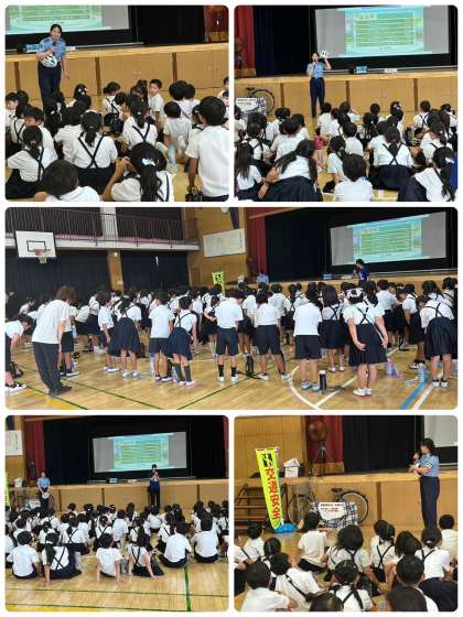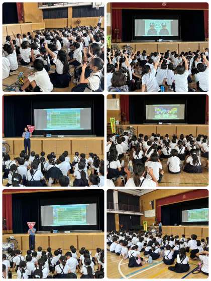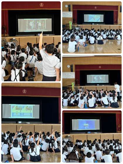 本来なら運動場で地域の方々とともに一緒に歩く学習を予定していましたが、昨日の激しい雨のため運動場を使わず、講堂で、1.2年生は安全な歩行の仕方や、正しい自転車の乗り方について学習しました。安全クイズでは、一生懸命考えて答えていました。止まる・見る・待つを意識する「すわってダンス」も踊りました。