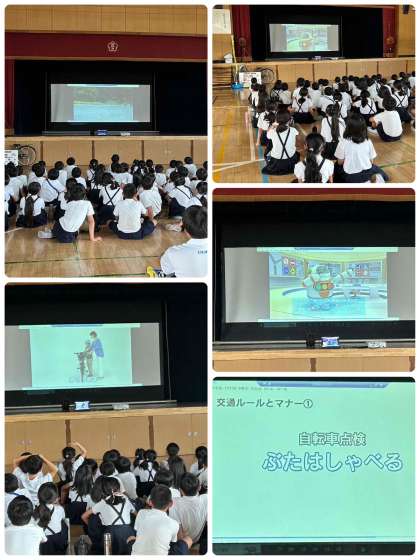 3〜6年生は正しい自転車の乗り方について学習しました。自転車での事故の映像を見て、どうすれば事故にならなかったのか、事故の原因を考えました。自転車の点検で大事なこと「ブレーキ・タイヤ・ハンドル・車体・ベル」の合言葉「ぶたはしゃべる」についても学習しました。