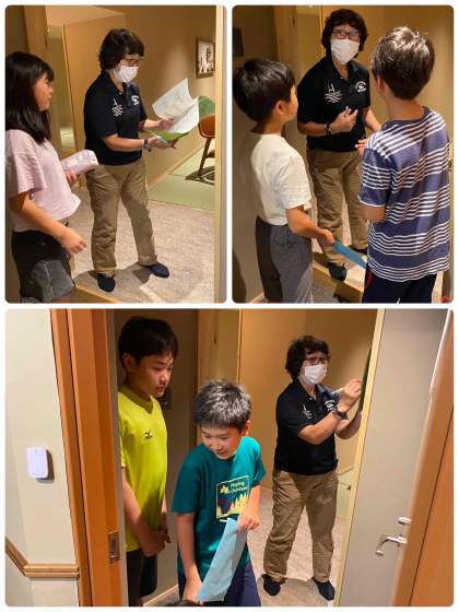 最後に保健係が健康観察した結果を楊井先生に報告して、室長は難波先生と室長会議をして、諸連絡を聞き、メモをして部屋のメンバーに伝えようとしています。