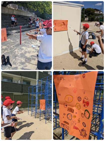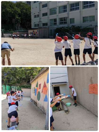 空気と水の学習をしています。学習の最後にみんなで的あてをしました。ワイワイ楽しく、せんや水が飛ぶしくみもよく理解出来ていました。