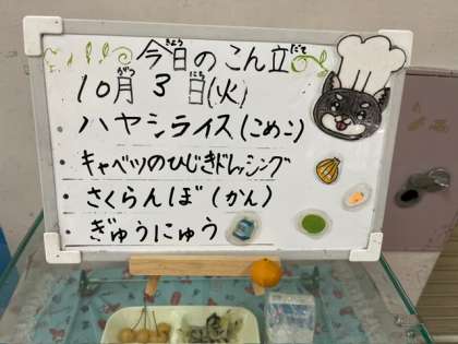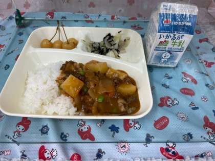 今日の給食は「ハヤシライス【米粉】、キャベツのひじきドレッシング、さくらんぼ(缶)、牛乳」です。