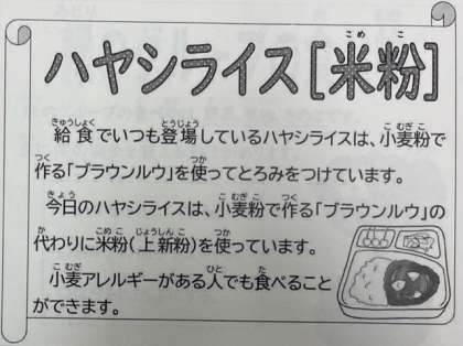 ハヤシライスは、ふだんは、小麦粉から手作りするルウでとろみをつけているのですが、今日のハヤシライス【米粉】は、米粉(上新粉)を水で溶いてとろみをつけています。小麦アレルギーのある児童も安心して食べることができます。油を使っていないので、ルウで仕上げるハヤシライスよりもあっさりとした味わいです。