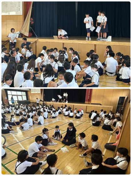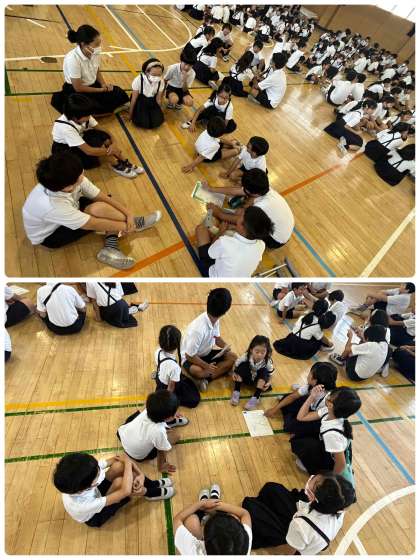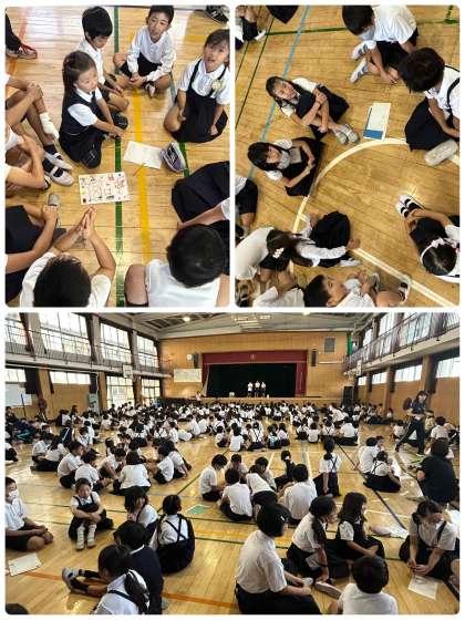 今日の集会は、加工したキャラクターの声当てクイズでした。班ごとで相談して答えました。なかなか難しかったです。