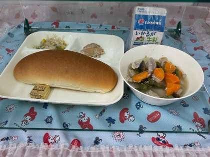 ? 今日の給食は、鶏肉のガーリック焼き、スープ煮、野菜のソテー、コッペパン、バター、牛乳です。