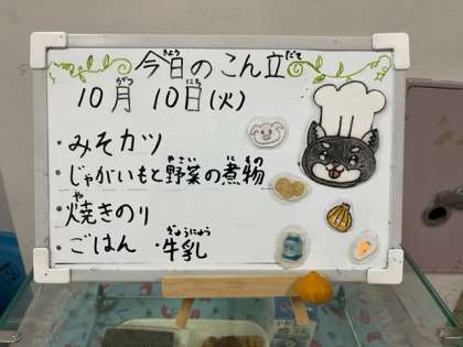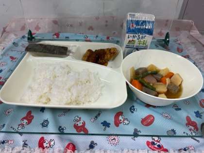 今日の給食は、みそカツ、じゃがいもと野菜の煮もの、焼きのり、ご飯、牛乳です。