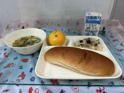 金時豆の中華おこわ、中華スープ、みかん、黒糖パン、牛乳