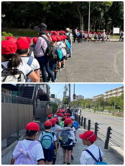 たっぷり遊んだ後、公園をきれいにして、学校へ戻っています。