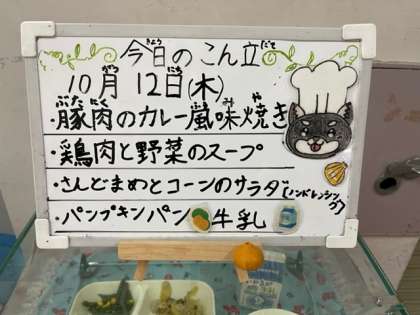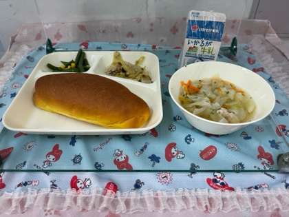 今日の給食は、豚肉のカレー風味焼き、鶏肉と野菜のスープ、さんどまめとコーンのサラダ(ノンエッグドレッシング)、パン、牛乳です。