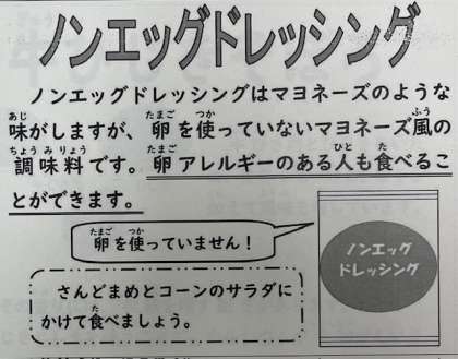 今日は「三度豆とコーンのサラダ」に、ひとり1袋の「ノンエッグドレッシング」をかけていただきました。ノンエッグドレッシングは、卵不使用のマヨネーズ風味の調味料です。卵使用のマヨネーズよりもさっぱりとした味わいです。