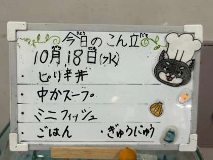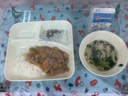 今日の給食は「ピリ辛丼・中華スープ・ミニフィッシュ・牛乳」です。