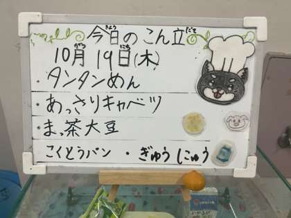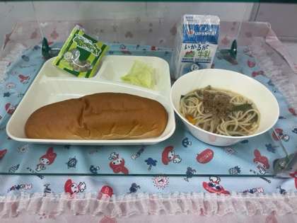 今日の給食は「タンタンめん・あっさりキャベツ・まっ茶大豆・こくとうパン・牛乳」です。