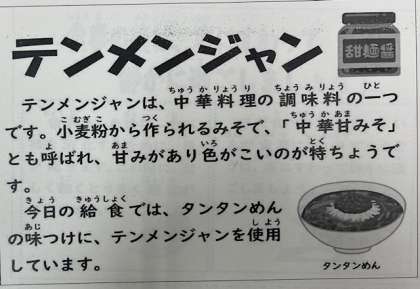 今日は汁麺タイプの「タンタンめん」が登場しました。後のせの肉みその味付けには中国の甘みそのテンメンジャンを使っています。