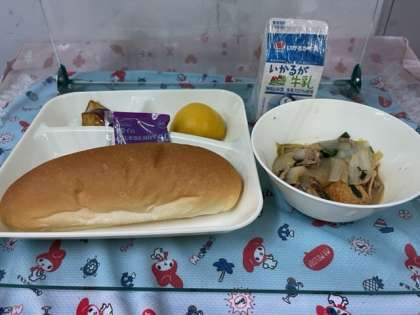 今日の給食は「豚肉といかの中華煮、大学いも、黄桃(缶)、パン、ブルーベリージャム、牛乳」です。