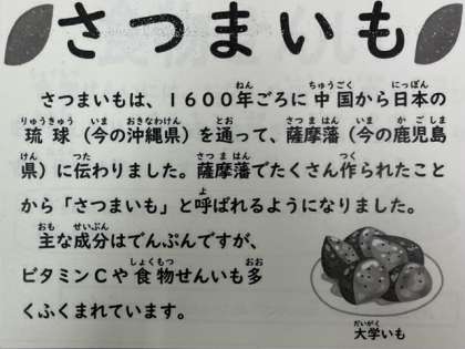 今日は子どもたちに人気の「大学いも」でした。揚げたさつまいもに砂糖、塩、こいくちしょうゆなどで作ったたれをからませています。