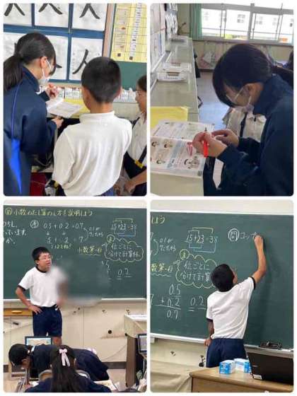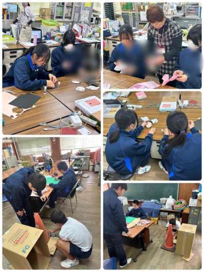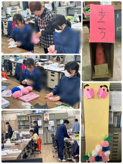 授業の中で関わったり、午後は作り方を教えてもらったり自分たちで考えたりしながら掲示物などの作成に取り組んだりしました。先生の仕事って、多岐にわたると体験できたようです。