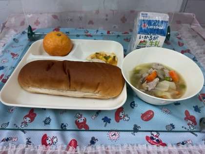 今日の給食は「豚肉と野菜のスープ煮・変わりピザ・みかん・コッペパン・いちごジャム・牛乳」です。