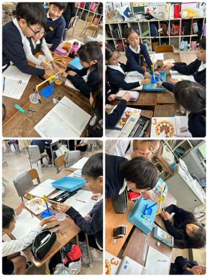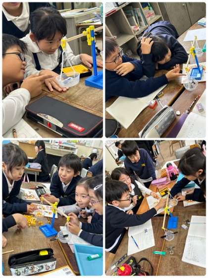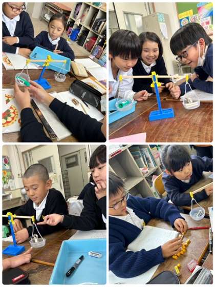 ものの重さをはかろうの学習が始まりました。今日はものの重さをはかるにはどんな道具があるかを考えた後、実際にてんびんを使って重さ比べを行いました。