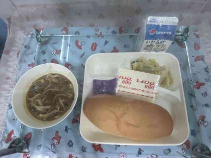 今日の給食は「カレーうどん・はくさいのおひたし・スライスチーズ・コッペパン・ブルーベリージャム・牛乳」です。