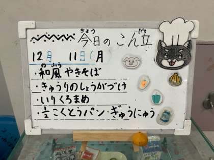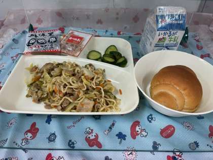 今日の給食は「和風焼きそば・きゅうりのしょうがづけ・いり黒豆・黒糖ロールパン・牛乳」です。