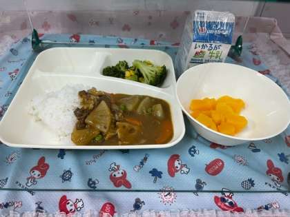 今日の給食は「冬野菜のカレーライス・ブロッコリーとコーンのサラダ・黄桃(カット缶)・牛乳」です。