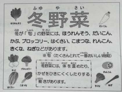 今日の冬野菜のカレーライスには、冬野菜であるれんこんとだいこんのほかに、にんじん、たまねぎ、しょうが、にんにく、青味にグリーンピースを使っています。れんこんやだいこんもカレーにとてもよく合います!ぜひご家庭でも試していただきたいです。