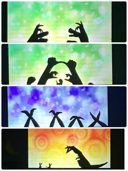 まずオープニングで様々な動物の手による影絵を見た後、実際に影絵の作り方を教えてもらいました。リスです。ぜひご家族でも挑戦してみてください。作り方は子どもたちが聞いていますし、劇団のYouTubeチャンネルにも紹介されているそうです。代表で実演してくれた人たちは、上手にできていました。