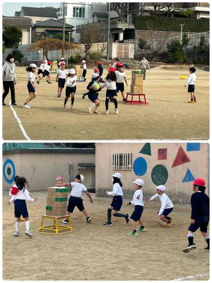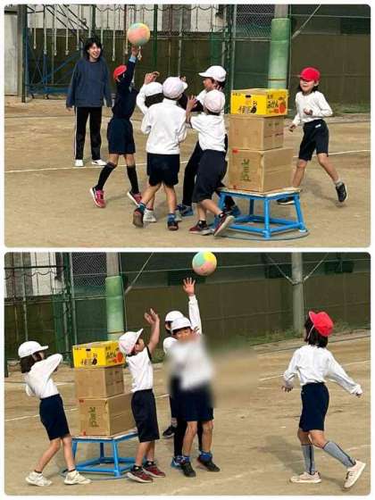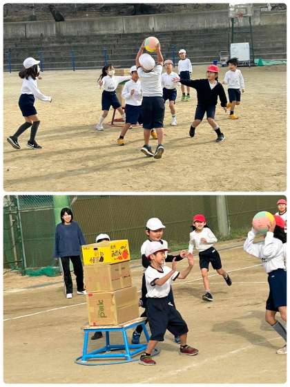 チームで協力して、ボールを投げて箱に当てて落とせば得点となる、というゲームです。