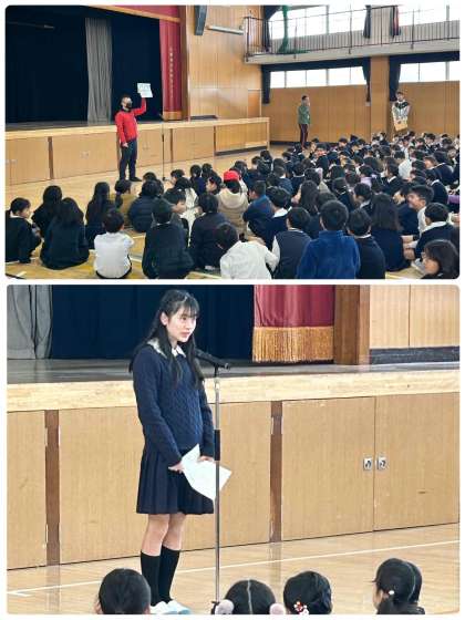 講堂に全員が集まり、転入生を紹介した後、校長先生からお話がありました。