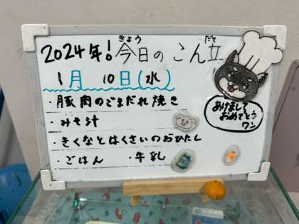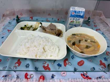 今日の給食は「豚肉のごまだれ焼き・みそ汁・きくなとはくさいのおひたし・ご飯・牛乳」です。