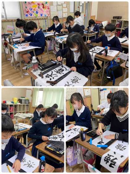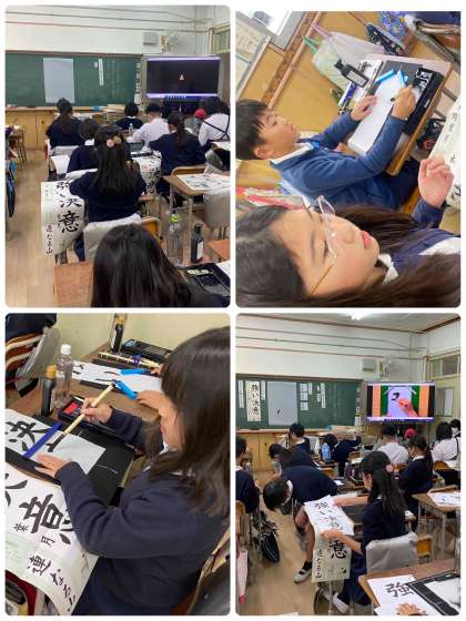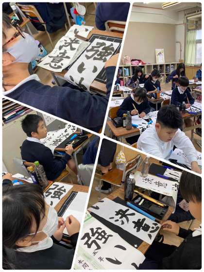 これまで学習してきた「書写のかぎ」を使って書き初めをしました。「強い決意」と筆で力強く書きました。