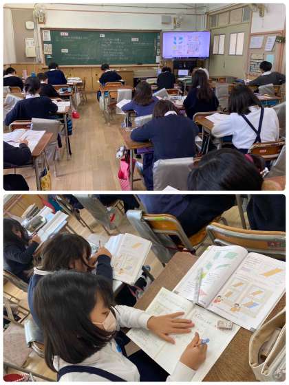 平行四辺形の面積を求める公式をつくりました。平行四辺形のどこの長さが分かればよいのか、習熟度別にわかれて考えました。これから様々な図形の面積を求める学習を行います。