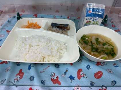 今日の給食は「さばのみそ煮・すまし汁・紅白なます・ごはん・牛乳」です。