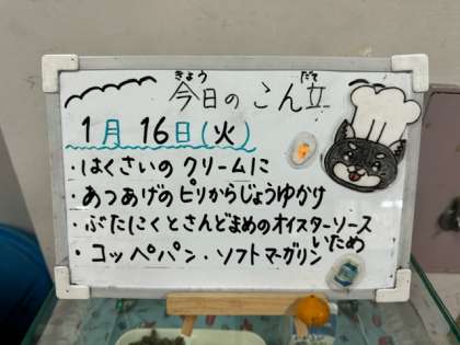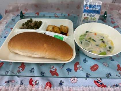 今日の給食は「はくさいのクリーム煮・あつあげのピリ辛じょうゆかけ・豚肉とさんどまめのオイスターソースいため・コッペパン・マーガリン・牛乳」です。
