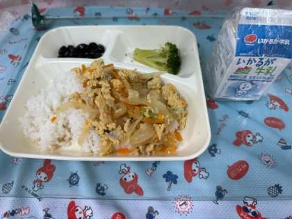 今日の給食は、「親子丼、ブロッコリーのごまあえ、黒豆の煮もの、牛乳」でした。